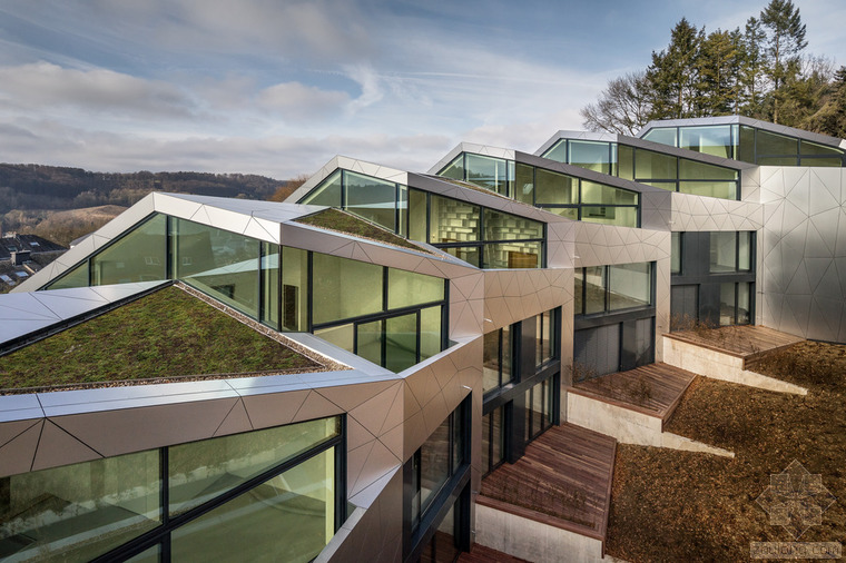 根據(jù)城市建筑規(guī)章條例規(guī)范,無論地形有多奇怪,都可以建造簡易的兩層單體建筑,并且?guī)в械叵率?。但是,周圍的環(huán)境、特殊的地形條件和基地的形式造就了各種各樣的建筑,與此同時也產(chǎn)生了上文所指出的問題?;匚挥谝粭l十分彎曲的街道邊緣;地形高差達10米,非常陡峭;基地上保留有樹齡300年的古樹,且被列為國家歷史文物。所有的這些狀況使建筑有了最初的形狀。此外,該建筑還呼應(yīng)了特殊的城市環(huán)境(一邊是小體量的住宅單元,而另一邊是大體量的公寓樓。)建筑師通過將主體分成六個小的、垂直位移的體塊,創(chuàng)造了一個巧妙地轉(zhuǎn)變。建筑通過這種方法適應(yīng)了環(huán)境,既保持了所需的密度,又賦予其歸屬感、特性和人性化。體塊的分割和位移需要謹慎地研究自然采光的需求、朝向城市景觀的開闊視野,并且創(chuàng)造天地之間的視覺連接,同時還要保護住戶的隱私。