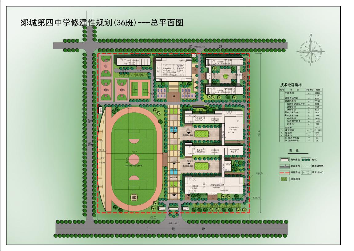 學(xué)校位于郯城縣,學(xué)校總建筑面積為27950平方米,設(shè)計(jì)人員根據(jù)功能把不同功能的建筑物放到不同區(qū)域,然后再把不同單體安照建筑美學(xué)重新排列,總共分成4個(gè)區(qū)域。每個(gè)區(qū)域排列著相應(yīng)單體,教學(xué)區(qū)域排列兩棟教學(xué)樓和一座科技實(shí)驗(yàn)綜合樓,三個(gè)單體之間用連廊鏈接。生活區(qū)把男女宿舍樓放在最東邊,并把教師周轉(zhuǎn)房放到西邊,在男女宿舍樓與教師周轉(zhuǎn)房之間放一座綜合樓,這樣綜合樓面對(duì)大門(mén)口,使得之間的開(kāi)拓出來(lái)一條知識(shí)長(zhǎng)廊大道。讓進(jìn)入學(xué)校后感受到進(jìn)入到了知識(shí)的海洋。最西邊活動(dòng)區(qū)排列了操場(chǎng)及籃球場(chǎng)。讓學(xué)生們?cè)谡n余時(shí)間能有足夠的活動(dòng)空間。